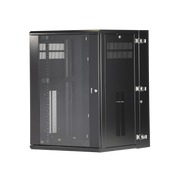 Gabinete de montaje en pared construido en acero, soporta 18 unidades de Rack para equipos de red activos o pasivos. Cuenta con paneles laterales totalmente desmontables y esta diseñado para permitir el control de clima adecuado para uso con diversos equipos de red, así como Switches de alimentación remota (PoE) y fuentes de alimentación ininterrumpida (UPS).